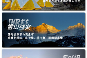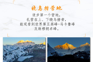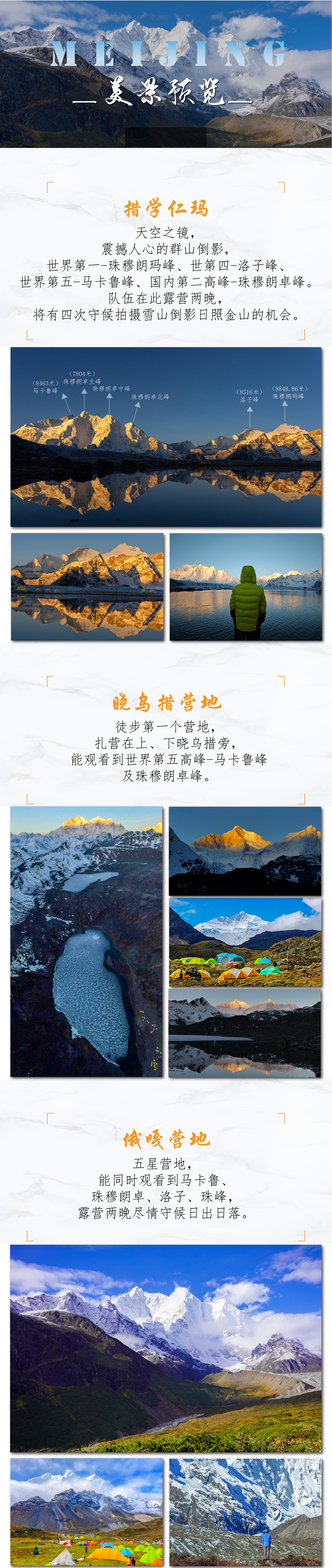 2、这条带有探险性质的高海拔深度行摄线路,可以近距离欣赏我国喜马拉雅核心地带的世界第一高峰-珠峰、世界第四的洛子峰、世界第五的马卡鲁以及全景都在中国境内的第二高山峰珠穆朗卓等世界级雪山带来的震撼之美,人迹罕至,恍若梦中的香格里拉。
