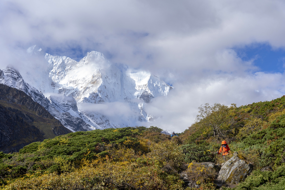 (徒步第3天)从兰花谷沿原始森林上行,植被垂直分布状态明显,到达山脊后可俯瞰嘎玛沟全貌,如果有缘更可以邂逅马卡鲁峰(8463米)。中午到达雪山怀抱的措朗湖。湖水经过一个泄水口注入嘎玛沟内,措郎山谷两端雪山相映。午后翻过一个垭口就到达了野花灿烂的夏侬牧场,然后一路都比较平坦,一直到达今天的营地汤湘观景台营地。