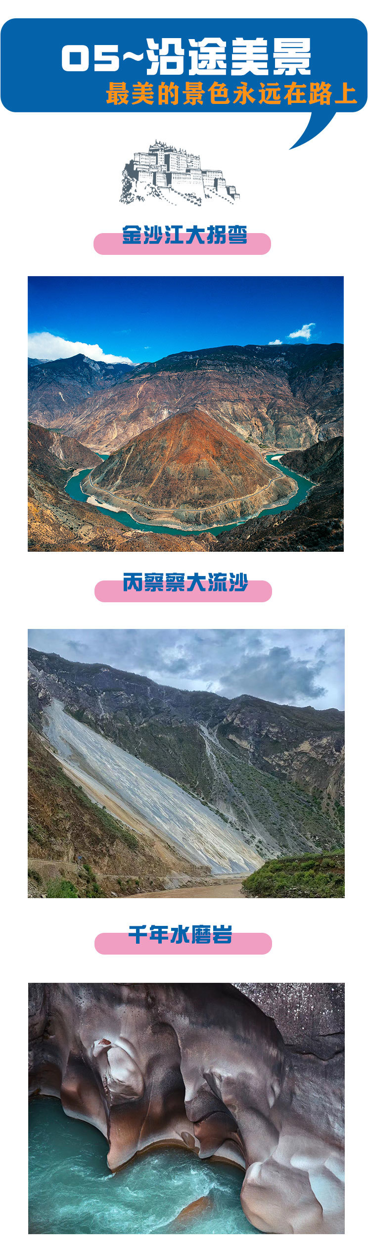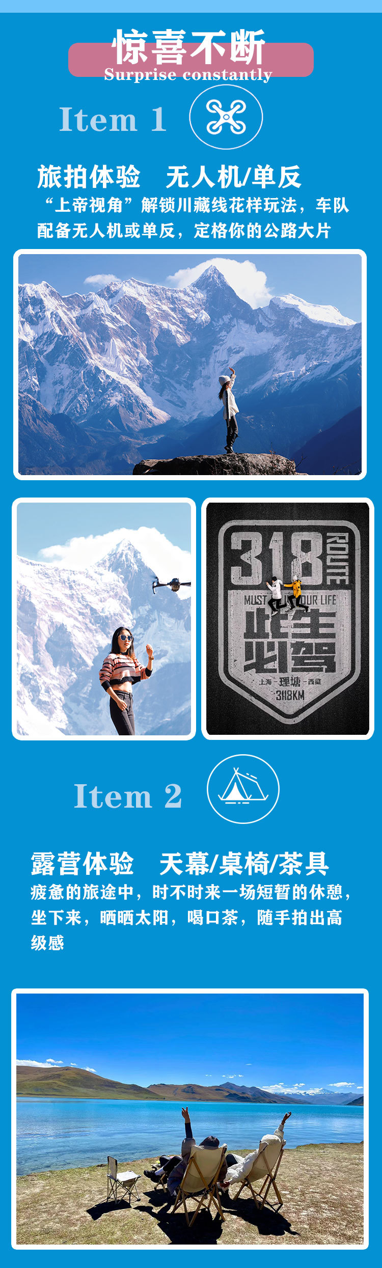 行程张弛有度,平均每天270公里左右,拒绝超长车程,留足时间尽兴游玩;融合川藏春季精华317路段+318路段,享一场视觉盛宴