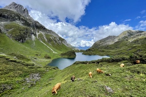 在高山之间有一方碧蓝的湖水,被草甸、牛羊、鲜花包围着,那种蓝有种沁人心脾之美,即使静静地看上半天,也丝毫不会觉得腻,仿佛永远看不够。