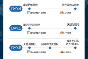 早餐后出发,会经过惊险的老虎口,最后与身后的天堂湖拍照留念,我们将翻越本次行程的最后一座高山阿克布拉克达坂,然后一路下行抵达博孜克日格河谷营地扎营,或前往黑英山营地。