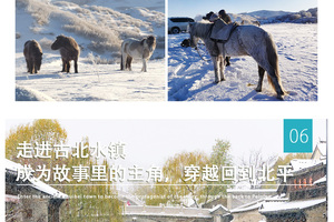 然后穿越雪地无人区,在【南井】、【蛤蟆坝】、【桦木沟】、【塞北雪乡】等地,寻找原始森林与冰雪创造出的人间美景。幸运的话,还可以看到群马、骆驼、牛群在雪地中狂奔的场景。中午吃完饭后,在雪地中继续穿越,大家可以坐在雪圈上,让车拽着尽情的的撒欢儿、漂移。