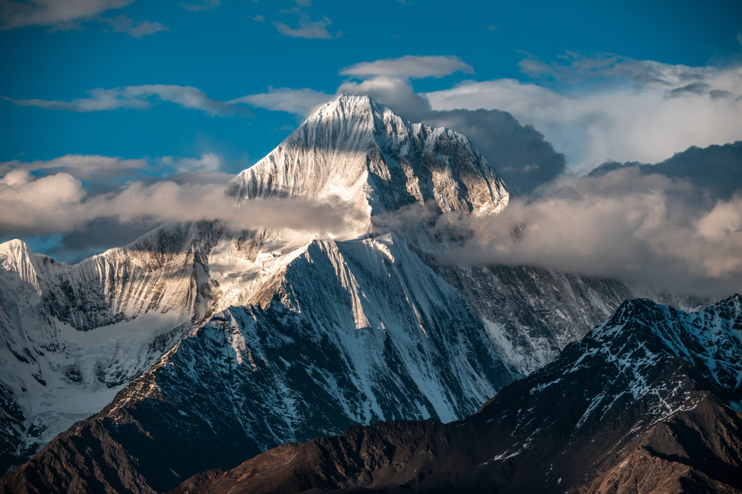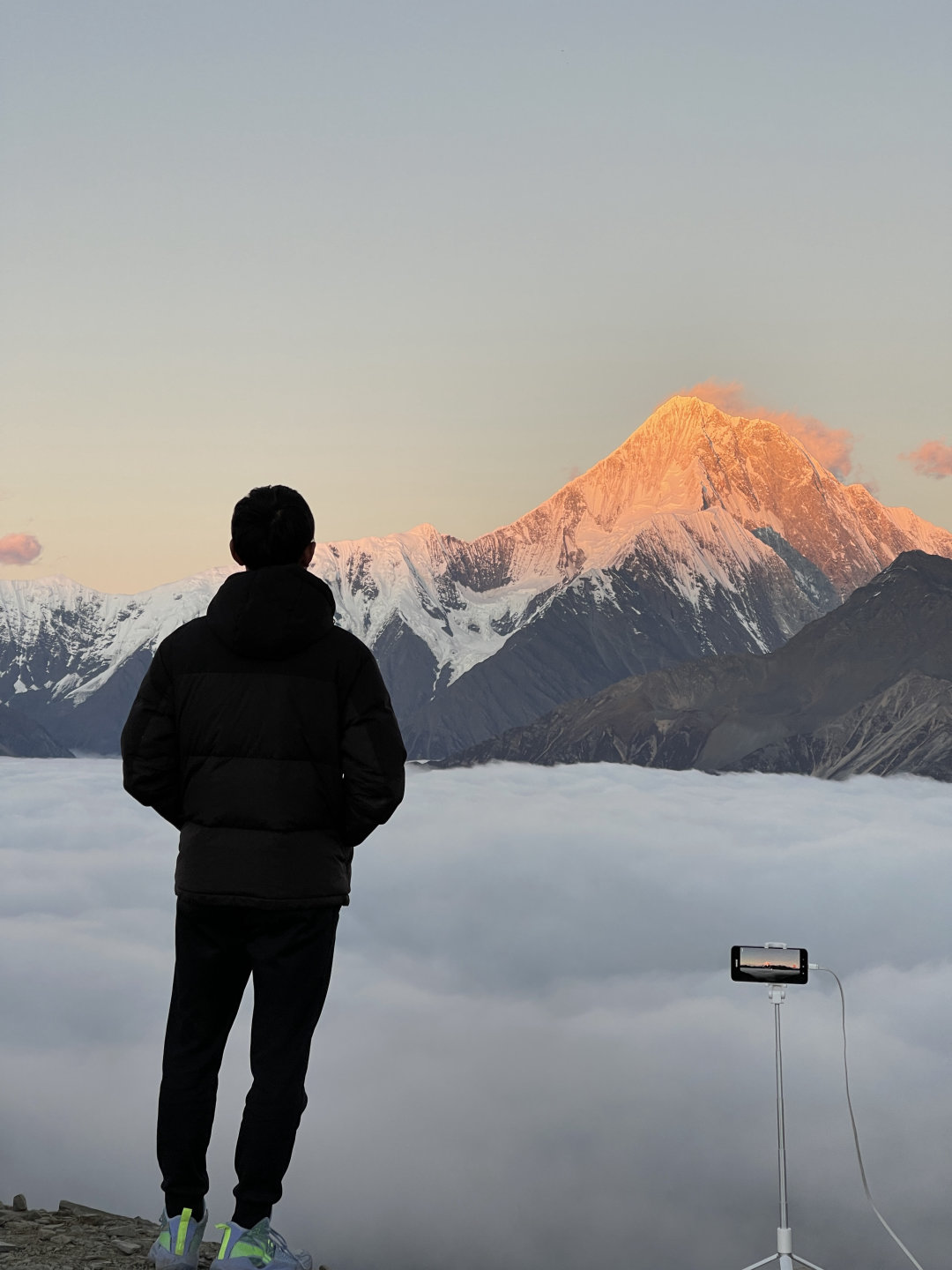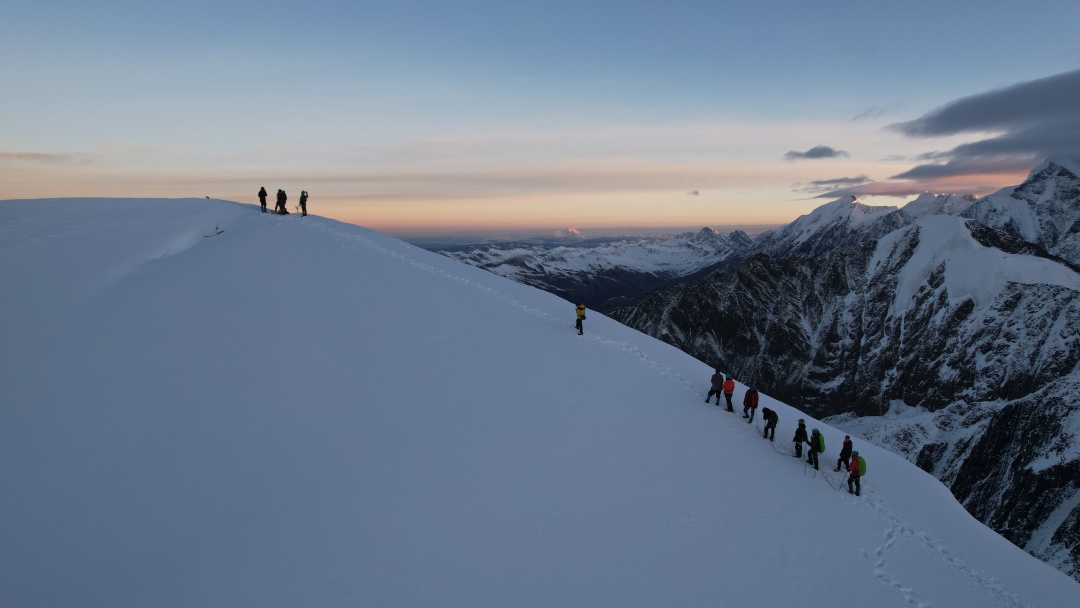 协作会根据当时的气候情况和队员体力确定在凌晨2~3点出发,经过碎石坡到达5200m穿冰爪处,沿路绳到达冰川顶部,登上5588m顶峰,今天攀登全天的景色都非常好,12点之前登顶后返回大本营。继续下撤到子梅村。