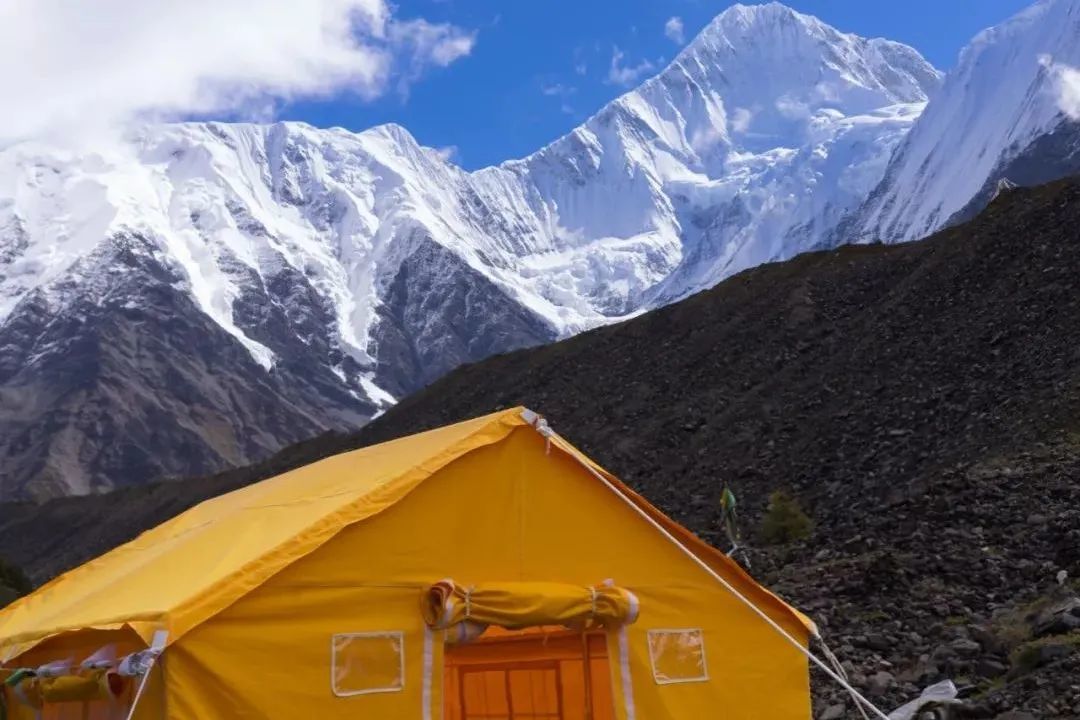 今日早上8:00从下子梅村徒步至贡嘎寺,贡嘎寺位于贡嘎主峰下,是藏传佛教噶玛噶举派(白教)的三大圣地之一,是观赏和拍摄贡嘎雪山主峰的最佳位置。贡嘎寺出发,走冰川河谷路线,沿着贡巴冰川往上走到那玛峰大本营。