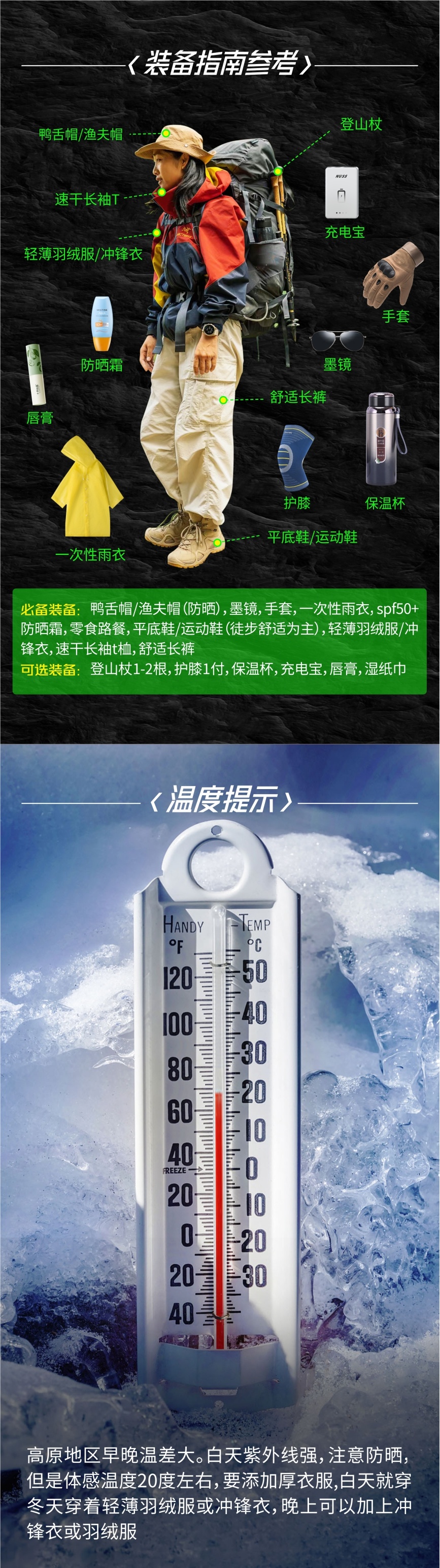 1、由于早晚温差大、风大紫外线强,请准备帽子、墨镜、手套、防晒霜、唇膏、保暖防晒衣物、方便行走的鞋;