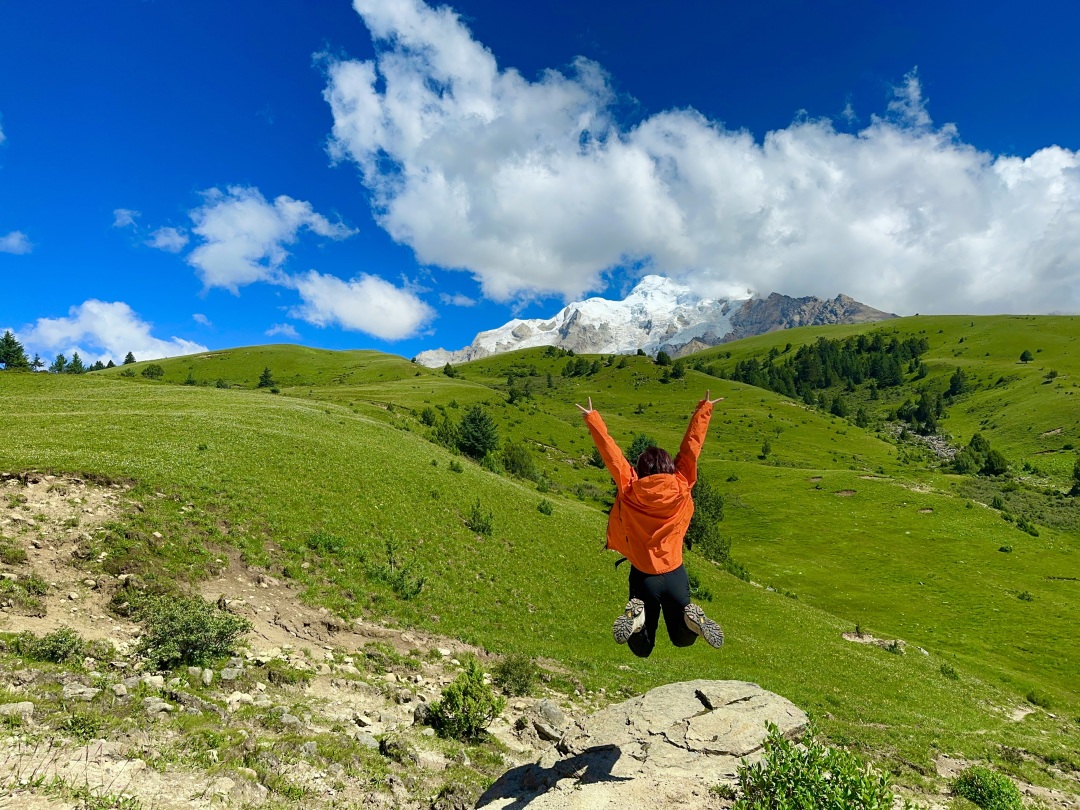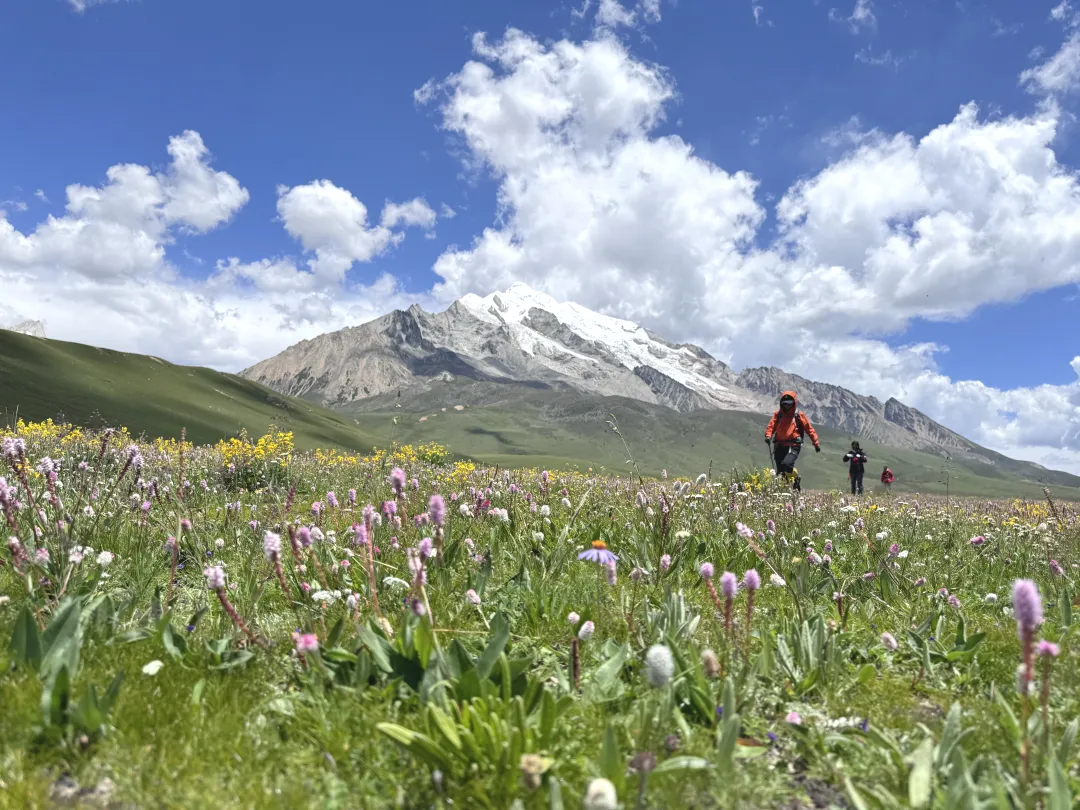 早餐过后离开夯达营地,从营地出发便开始爬坡,上到山脊之后,便开始一路横切,今天最大的难点就是在这段横切,需要翻越十几个大大小小的峡谷,对体能来说是一个考验,但是在这里,一路都是草甸,一路都是各种各样的野花,一路都能够看见格聂神山,形影不离的陪伴左右,足以让你忘记疲惫,享受美景;下午经过最后一道峡谷,也是最大的一个岛岛河谷,之后便能够看到今天营地了,今天的营地位于热梯河谷之中,这里是最后一个能够看到格聂神山的营地;翻过岛岛河谷旁边的山脊,一路向下经过一条河,再往河谷深处走几公里就到今天的营地了。大约下午三点左右就到今天的营地了。