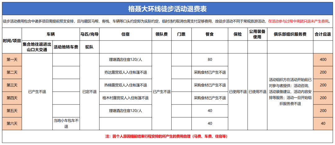 5.活动进行中,因个人原因退出,仅退还活动中未产生的费用,下撤途中额外产生的所有费用(如骑马、车辆、食宿等)自理。