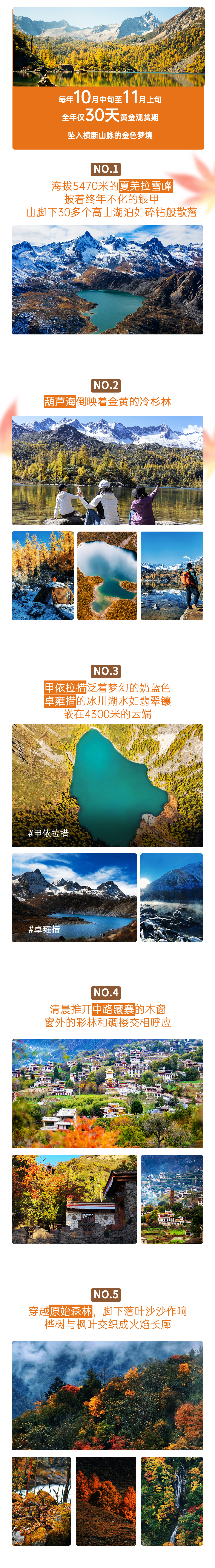 秋季(9、10月):无论是从气候、景色来说,秋季都是最适合前往高原旅游的,五彩斑斓红叶,野花、青稞、雪山和谐地搭配在一起,构成了最独特的美丽。但高原的秋季非常短暂,这是最令人遗憾的。