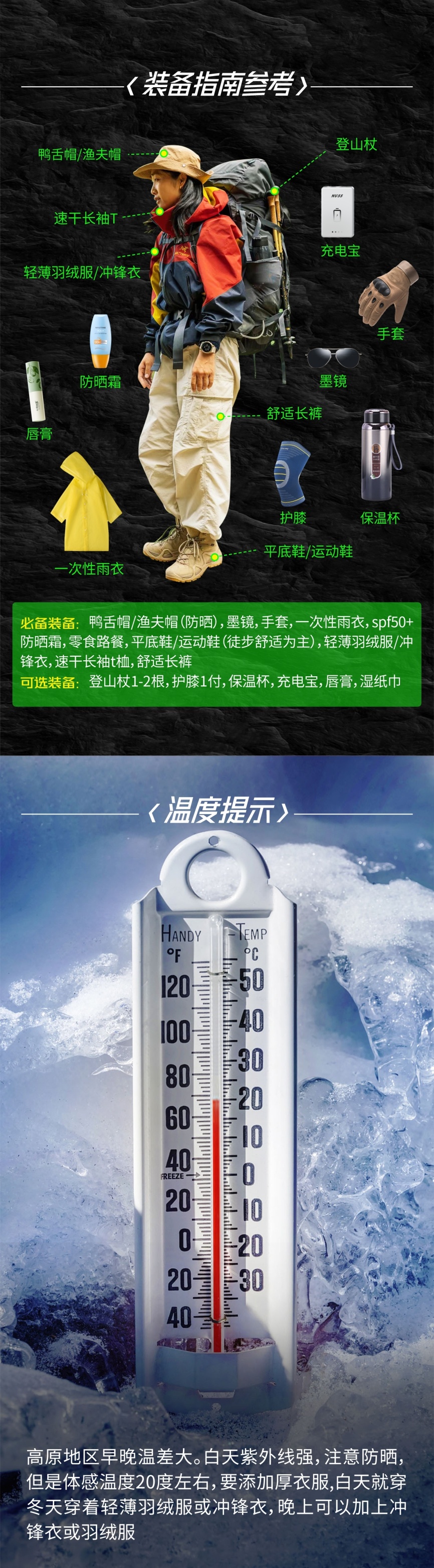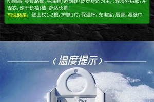 平底鞋/运动鞋,登山杖,一次性雨衣,鸭舌帽帽,墨镜,防晒霜,羽绒服或者冲锋衣,保温杯水杯,充电宝,唇膏,湿纸巾,零食少量,手套
